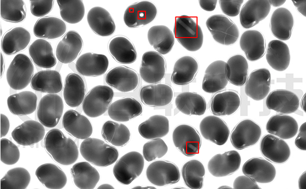 利用AI算法精准识别谷粒缺陷导致的X光深色影区,触发剔除装置实现精准去除。